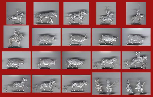 Die Figuren sind in sehr gutem Zustand, glänzend blank. Die Bilder geben Auskunft über die Qualität der Stücke. Größe 30mm Figuren. Es handelt sich um unterschiedliche Typen, vorwiegend Ochsen, Zugpferde. Teilweise noch zu variieren. Seltene Stücke, heute sicher kaum noch zu bekommen! Zur Herkunft liegen leider keine Angaben vor (Ausnahme Kutscherfiguren -Gravur Fritz). Insgesamt sind es 49 Figuren, davon ca. 25 verschiedene!